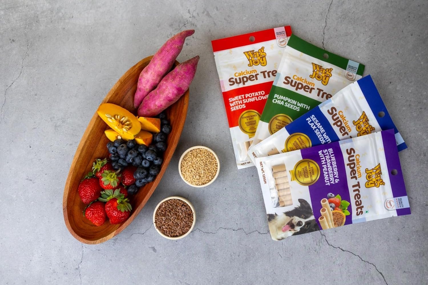 WAG IN JOY Calcium Super Treats Sticks 125 GMS | 100% Vegetarian Dog Treat|| Strong Bones and Joint| with Omega 3| Dog Food|Pack of 1| Pumpkin with Chia Seeds|,Young